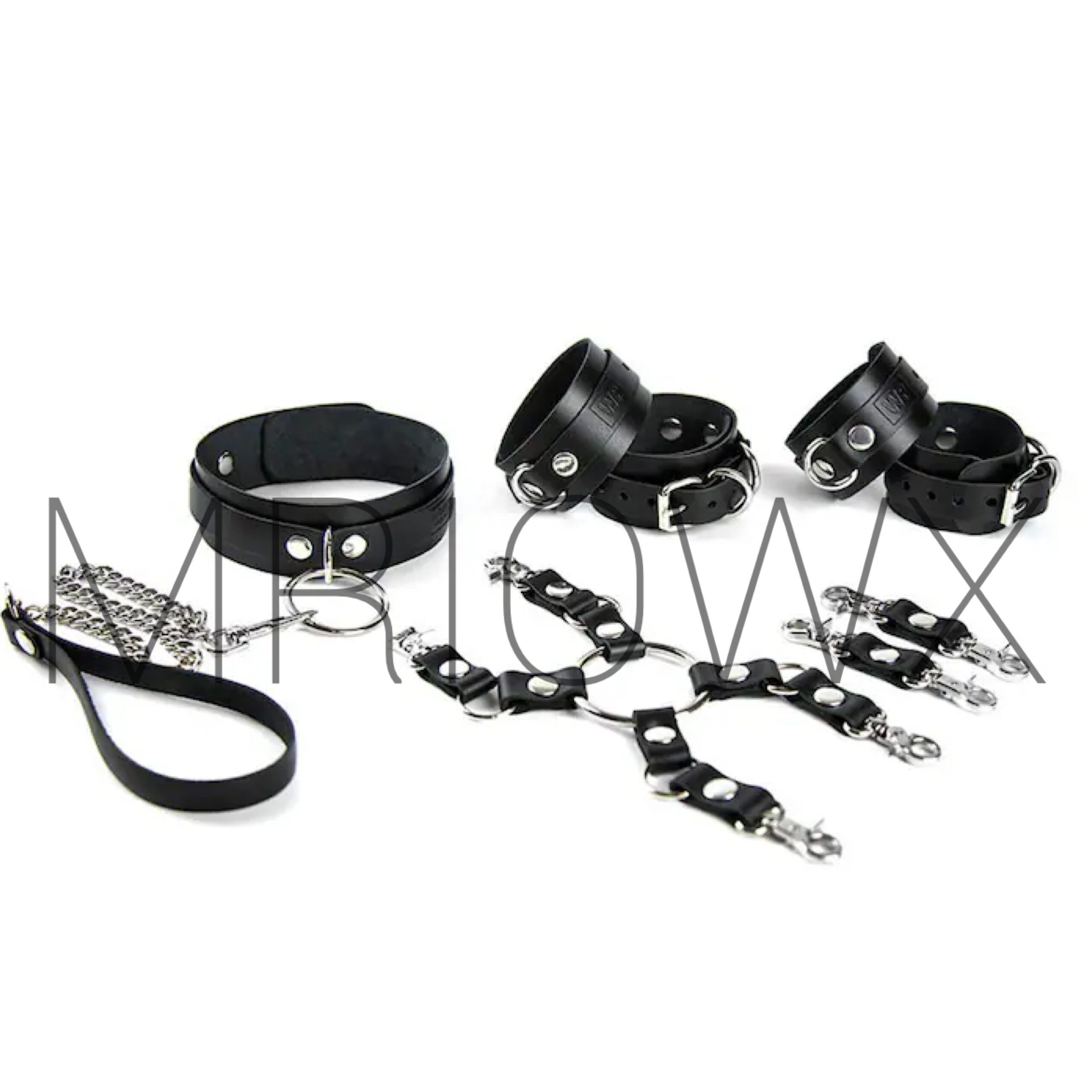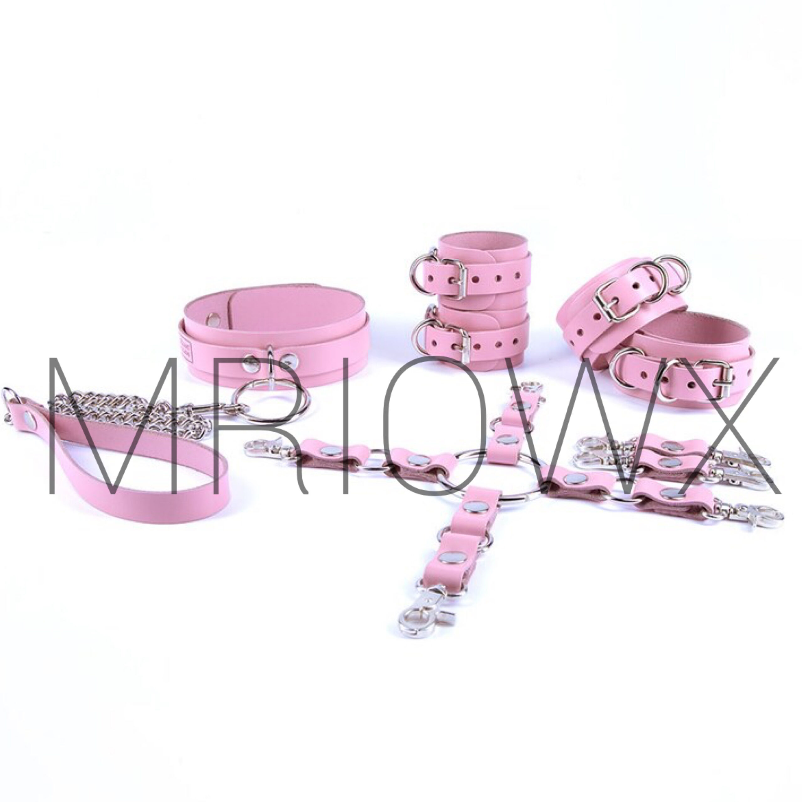 ست شامل : یک جفت دستبند – یک جفت پابند – چوکر – اتصال ایکس – دو عدد گیره اتصال